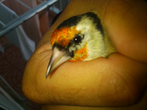 el caso es que uno d los noveles que tenia despues de la muda le ha salido una mancha negra en la graganta i eso me llamo la atención ya que conozco bien solamente el caso de los barbetas o corbata blanca. he intentado documentarme sobre la existencia de los corbata neegra o collar negro, ya que algo havia escuchado ablar. he visto que hay alguna foto d algun jilguerillo kn esas caracterisiticas. me gustaria saber si es una mutación o algo asi o solo esta relazionado con la pigmentación. al fijarme mas en el pude ver que en la nuca la parte que separa la franja negra d la marron era mas blanca que los demas i al cojerlo he podido apreciar una mancha naranja en un lateral y otra amarilla en el otro lateral. El pajaro tiene seis habas. he visto que dicen que los de la mancha en la nuca les llaman reineta o real.