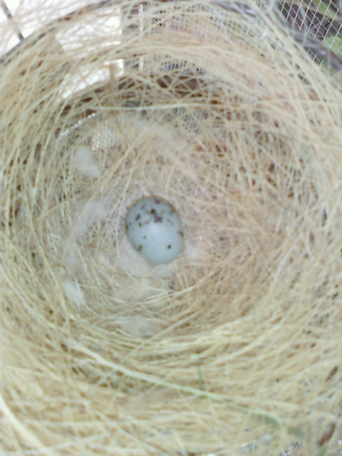Este año no se están portando mal del todo,ya hay otra hembra con su primer huevo,esta vez en voladera.Os pongo una foto del nido para que podáis comprobar que las hembras de picogordo no tienen entre sus mejores cualidades la de la construcción.Sólo usan fibra de coco (y poca),cuando tienen a su disposición muchos más materiales.