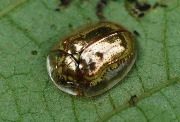 Escarabajo Tortuga Dorado (Charidotella sexpunctata), este insecto posee un tamaño de 5 a 7 milimetros y su principal característica es su brillo como si estuviera bañado en oro, sin embargo el color puede cambiar en su caparazón simulando al de una mariquita de color rojo con manchas negras, este cambio de tonalidad se logra por medio de válvulas microscópicas que controlan los niveles de humedad bajo su caparazón. Su principal alimento son las hojas de una planta llamada "Gloria de la mañana". Son originarios de América del Norte.