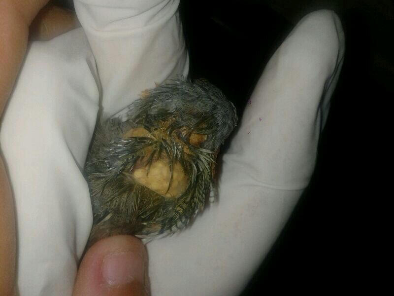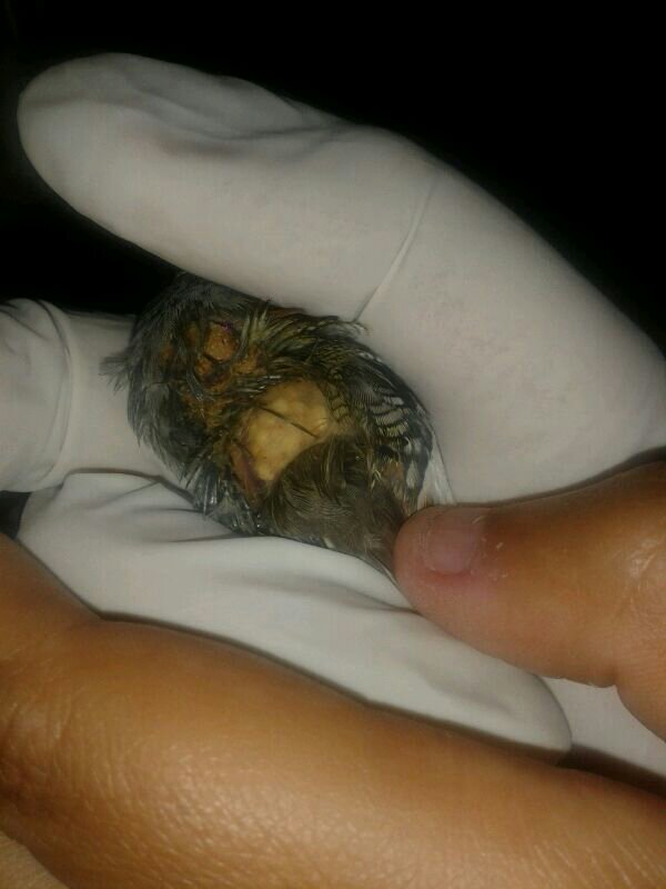 Hola Yurena, por lo que puedo ver en las fotos que como no estaran sacadas con mucha resolucion cuando las amplio para intentar apreciar mejor el problema se ve demasiado borrosa, pero parece solo como que le han picoteado en el cuello y alrededor del ojo, si no puedes poner unas fotos mas nitidas donde se pueda apreciar mejor la averia, que seria lo mejor, pues intenta explicarme que le aprecias tu, parece solo que le han picoteado, noooo. Un saludo