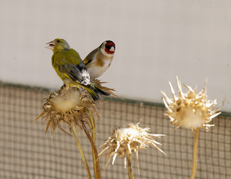 Por aquí de momento se han acabado los dientes de león y por eso he ido ha hacer una recolecta de cardos para que disfruten comiendo cosas que les gusta .A las canarias les saco yo las semillas ya que no saben ,ni se acercan  .Subo un par de fotos .