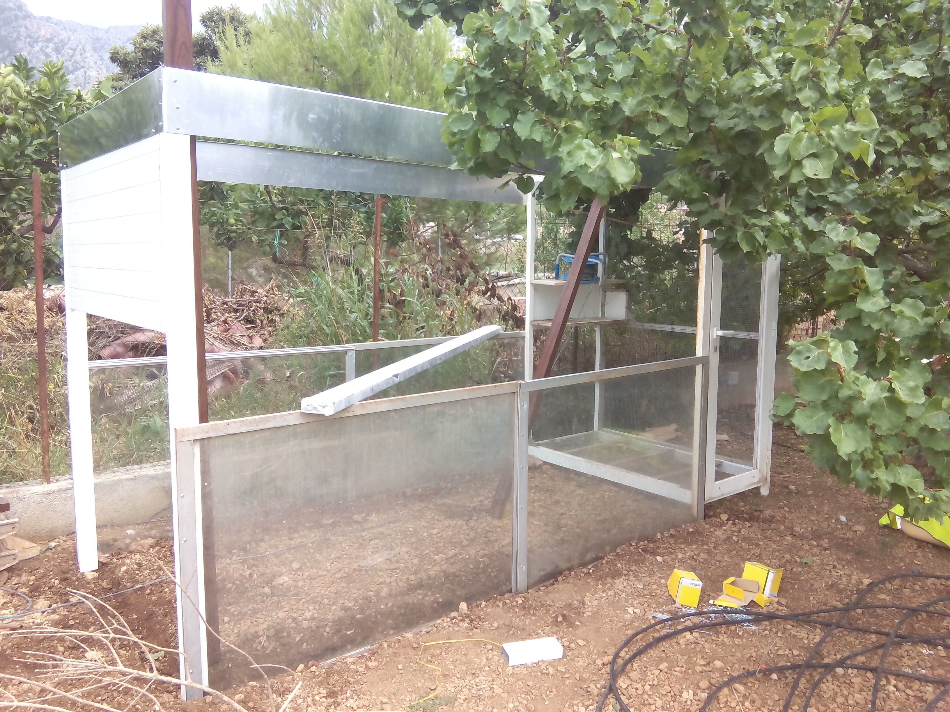 En la primera zona que es donde va la comida tiene un metro de rejilla que se podrá limpiar por de bajo y es donde le he puesto la comida para que no se coman comida en mal estado y los otros tres metros de momento se quedan así más adelante le are una estructura en la mitad y dos premarcos con rejilla pero primero quiero ver los árboles que he plantado que tal van y más adelante ya lo are . De momento sólo he puesto 4 canarios que quiero sacarme este año y aver que tal les va pero sus dos primeros días están geniales