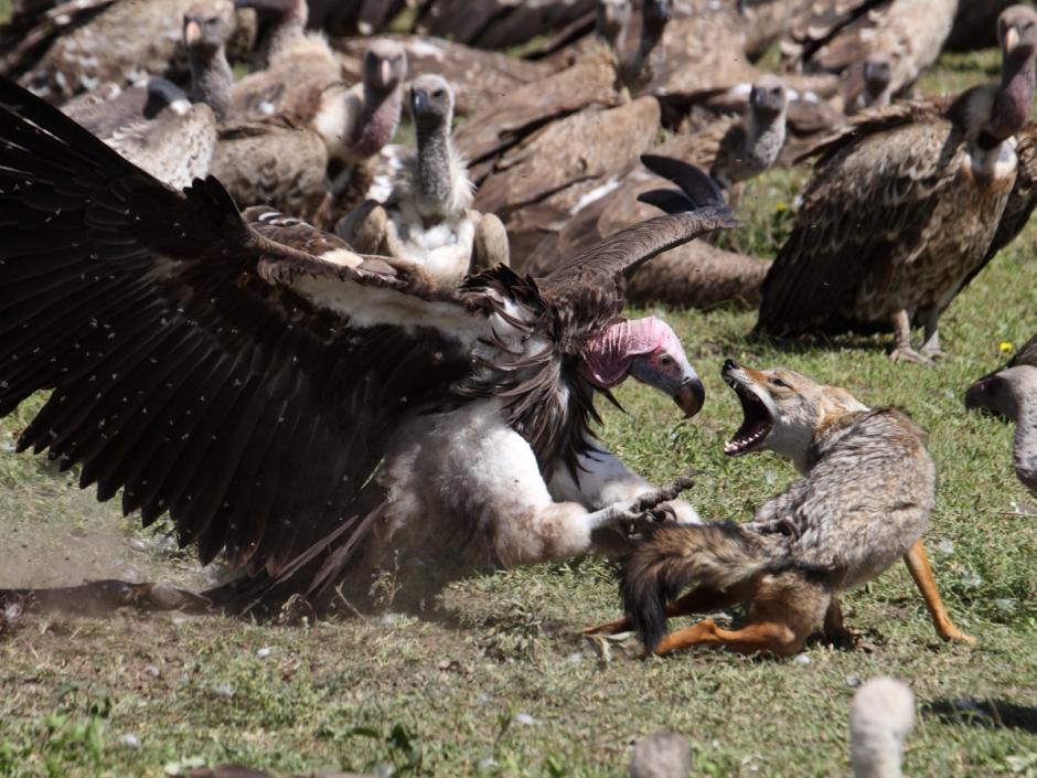 la del aguila y el zorro bravísimo. Una parecida, buitre orejudo dándole leña a un chacal:
