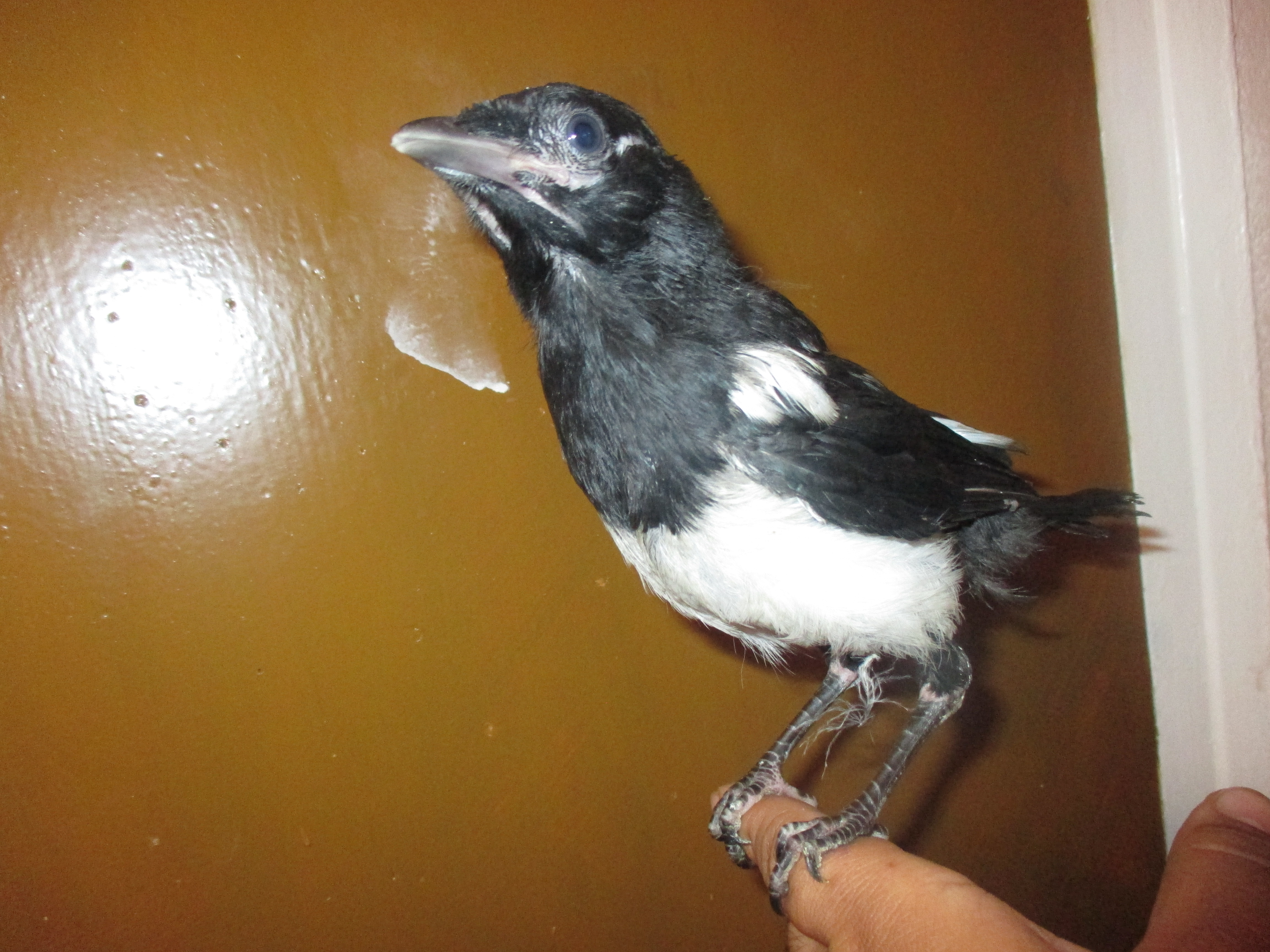 Bueno compañeros, voy a presentaros a Pica un pichón de urraca que encontré en muy malas condiciones en la calle al lado de una carretera. Habrá quien piense que hice bien, habrá quien piense que hice mal, pero en las condiciones que estaba dejarla ahí era dejarle morir sin duda. Si hubiese podido apoyarse o volar un poco, la hubiese dejado en el árbol pero nada. Soy el primer partidario como sabéis de echar los pajaros al árbol, pero también hay que saber decidir cuando un ave esta literalmente mal. Me la lleve a casa y le puse una mantica de calor de reptiles pues no tenía otra cosa, estubo a punto de palmarla por eso no lo colgué antes. Le daban unas combulsiones muy raras, pero bueno, con mimo, buena alimentación y cariño hoy esta sana y fuerte, empieza sus primeros vuelos después de 2 semanitas o así, también empieza a picotear y bueno¡ allá van unas foticos¡.