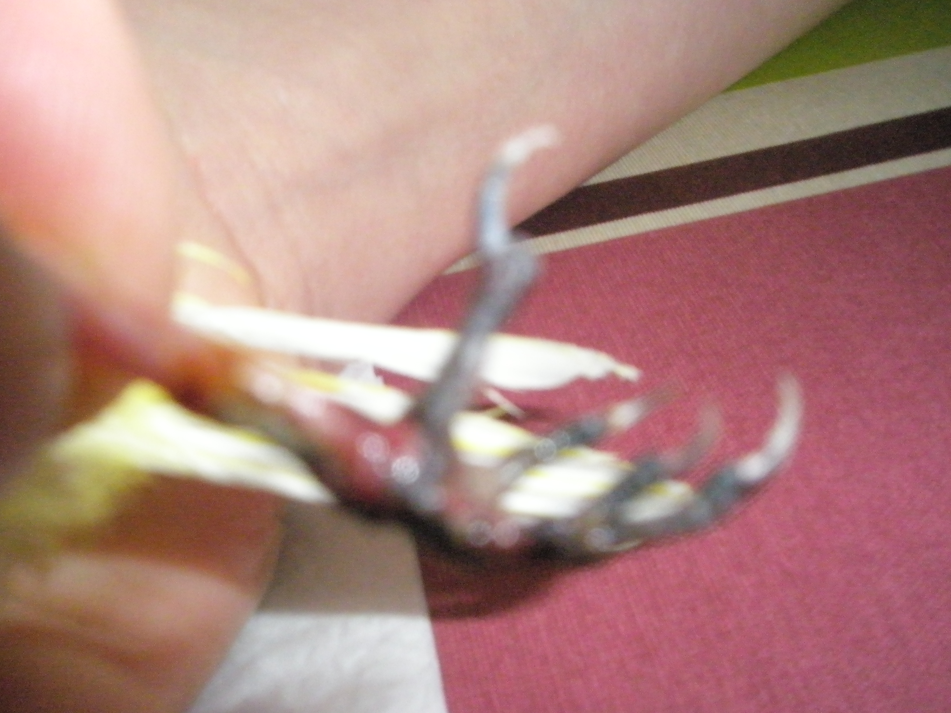 este es el aspecto de la pata del canario, no se ve muy bien, pero el color es negro, le estoy tratando una pequeña herida con agua