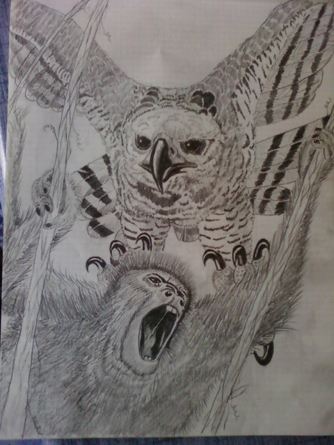 No encuentro ningún dibujo de ella en mi cuadernillo.Para rellenar,te pongo una Harpía o águila monera del Amazonas cazando.