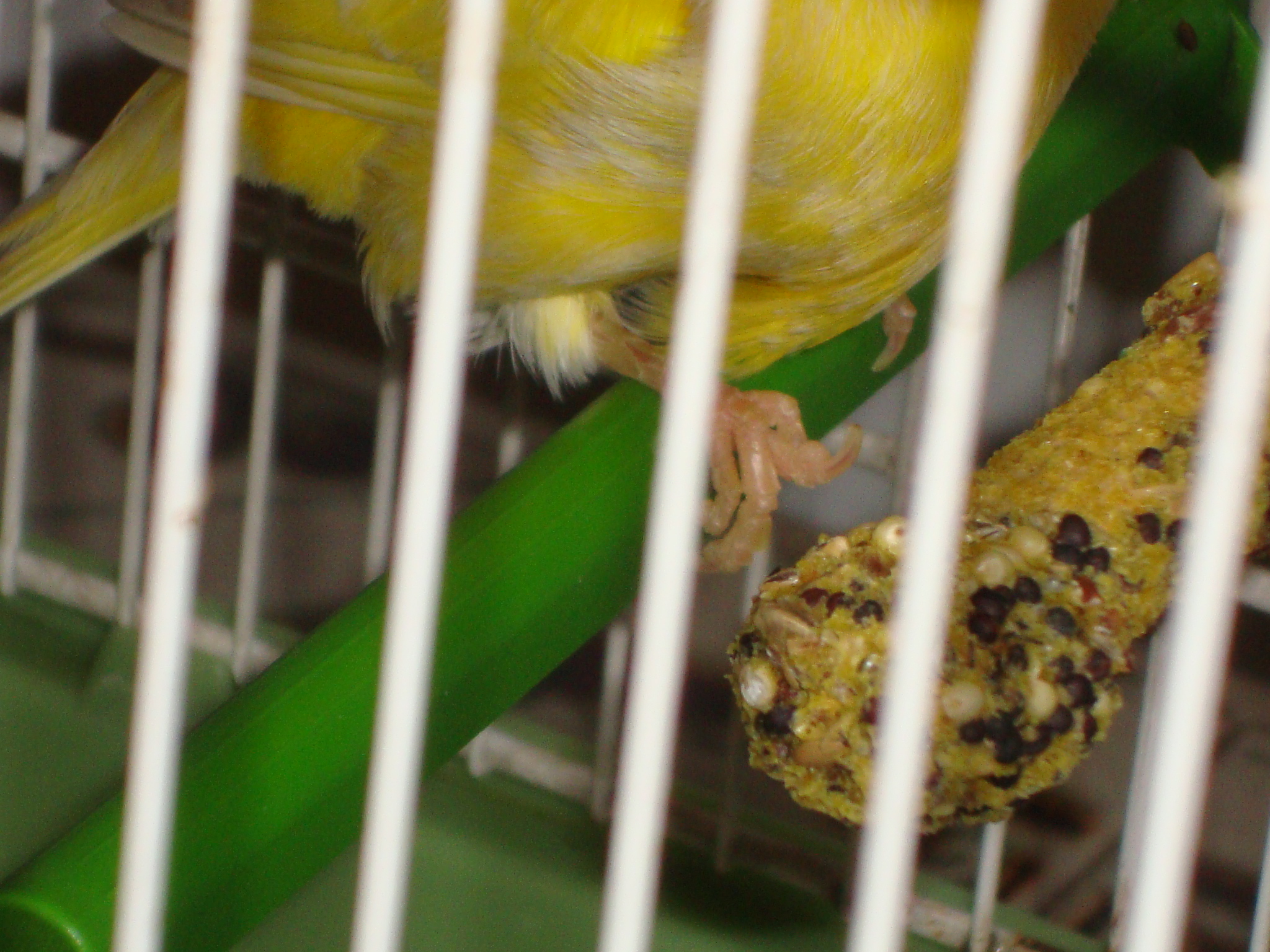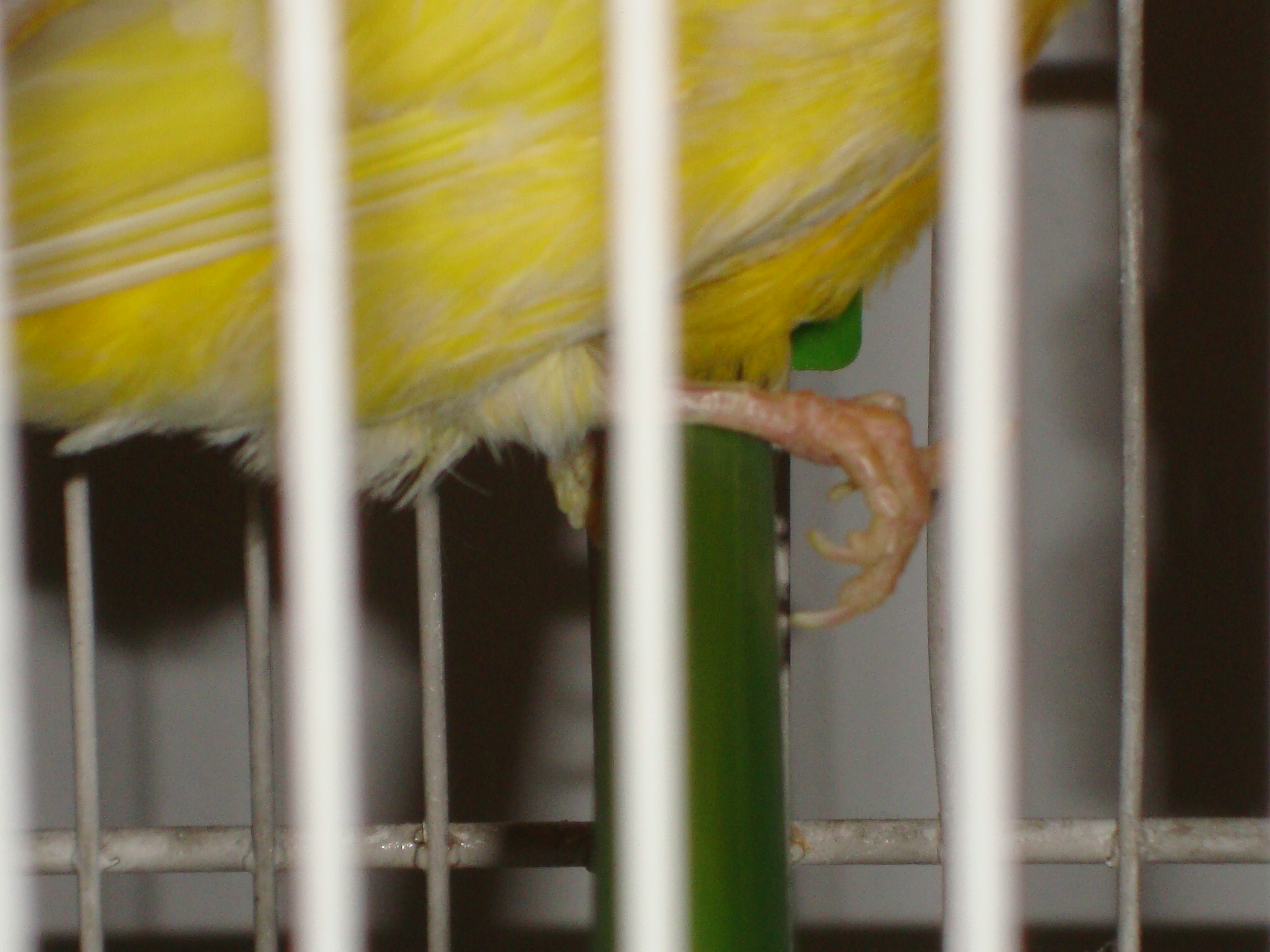 le he intentado sacar lo mejor posible la pata con el problema en las fotos. El dedo trasero se le va para adelante, en una foto se ve claramente cómo le sale la uña para arriba, y así no puede apoyar bien la pata en la percha.