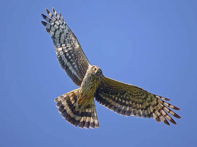 Identificación: Macho gris, se distingue del Aguilucho Cenizo por su obispilloRabadilla de las aves. blanco y ausencia de barras negras en las alas. Hembra castaña, con partes inferiores rayadas y barras negras en las alas.
