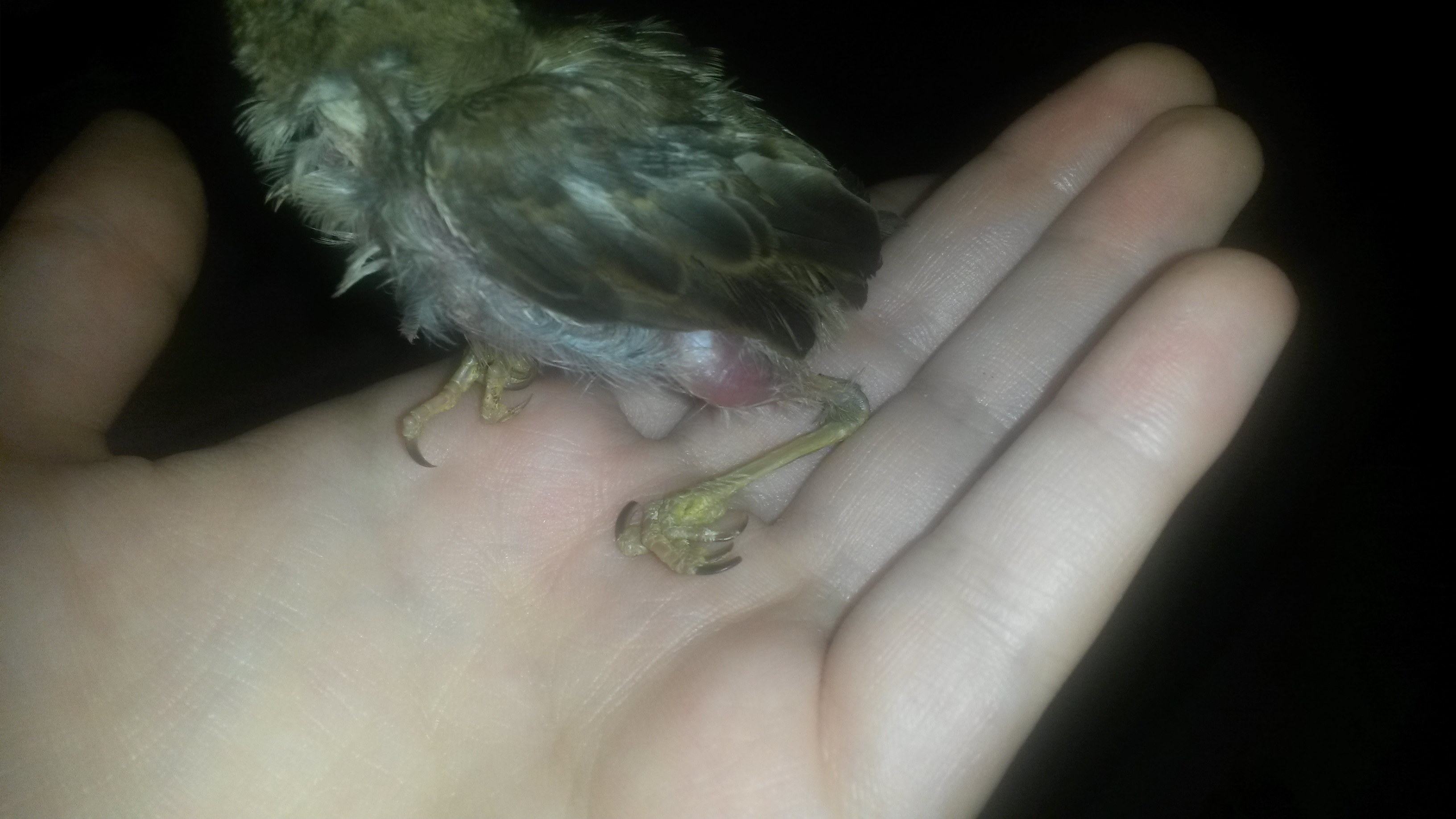 El problema de la pata puede ser debido a un aplastamiento en el nido cuando era pollo o incluso a un golpe producido por la caida del nido. El pájaro hará vida normal, ya que he tenido algún caso así y viven perfectamente.