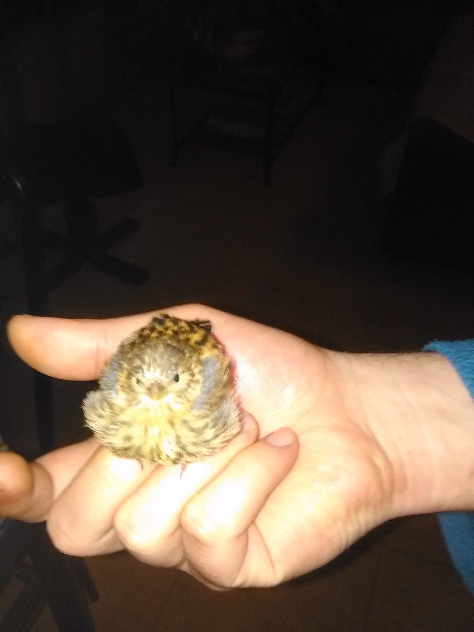 Gracias a todos por vuestra ayuda, vivo en un polígono donde solo hay naves industriales, no se de donde a podido venir, le estoy dando de comer con una jeringa, come y bebe agua, la pasta que le hecho, coser un huevo, un deo de agua templada y pan rallado, aun no vuela, no se donde soltarlo para que no le pase nada.